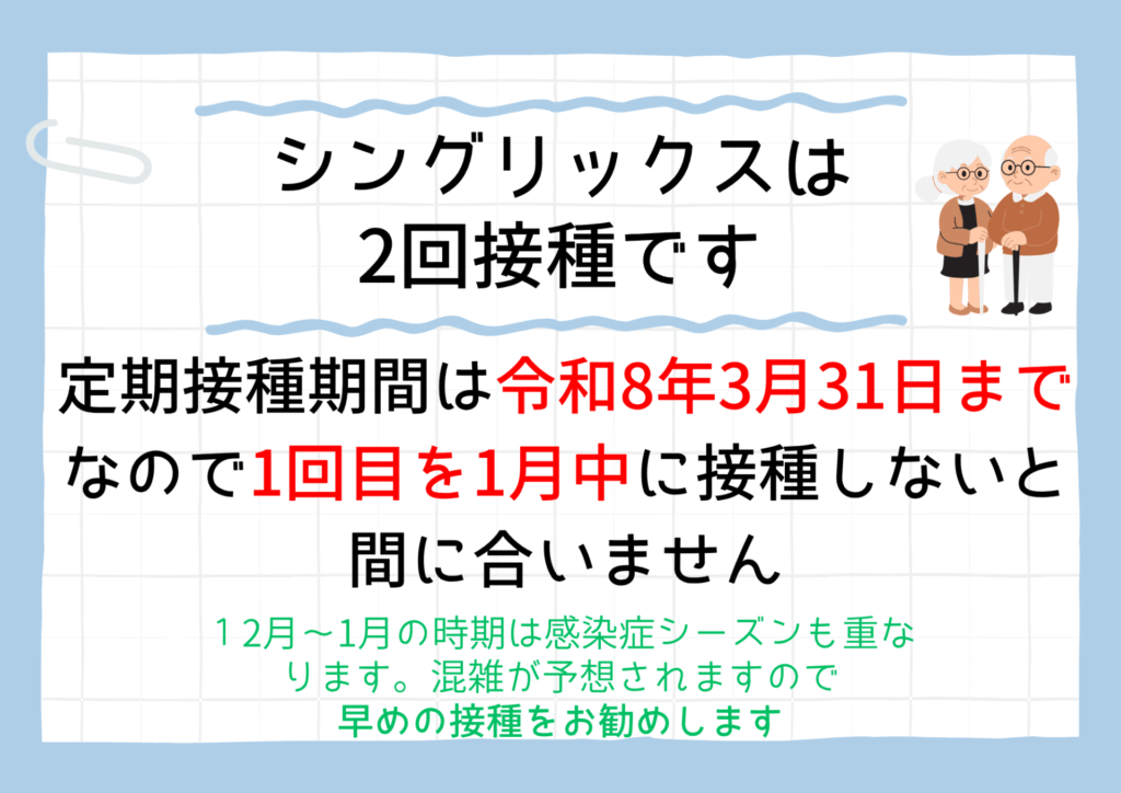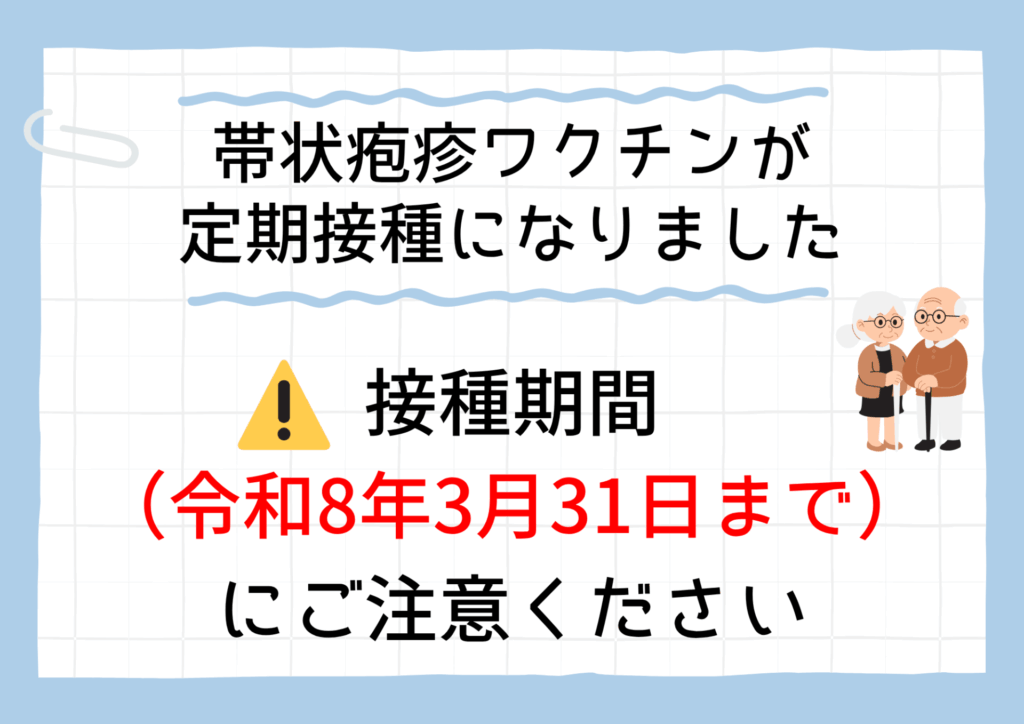 帯状疱疹ワクチンが国の定期接種になりました。接種期間は令和8年3月31日までです。(残り1か月ちょっとです)