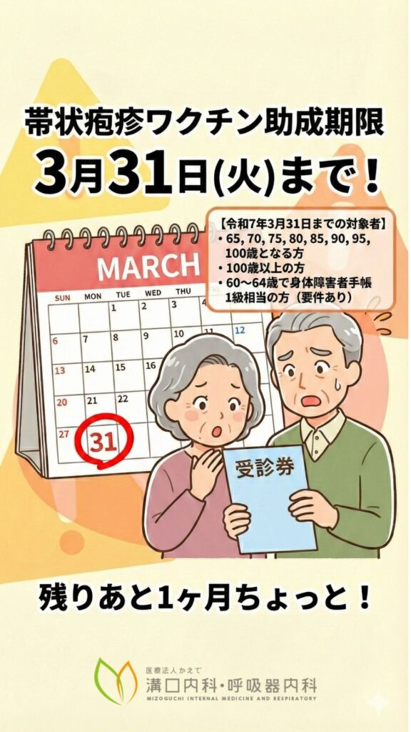 帯状疱疹ワクチンが国の定期接種になりました。接種期間は令和8年3月31日までです。(残り1か月ちょっとです)