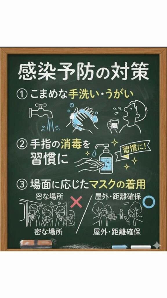 手洗いの励行、適切なマスクの使用、換気などの基本的な感染対策に努め、感染予防を心がけましょう。