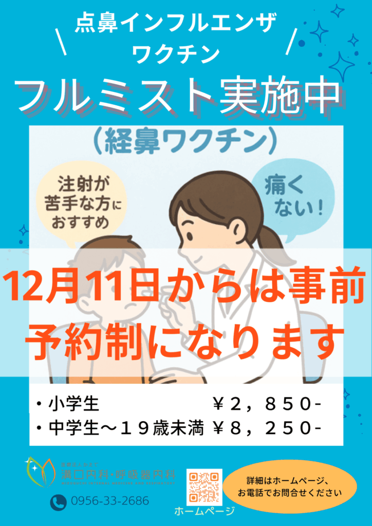 12月11日木曜より点鼻インフルエンザワクチン『フルミスト』を事前予約制とさせていただきます。